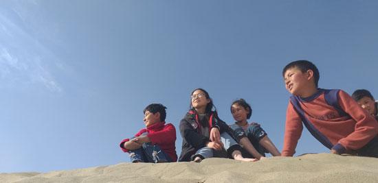 巴克墩村三面被沙漠包围,学生们带支教老师彭梦(左二)到沙漠玩。韩东锋/摄