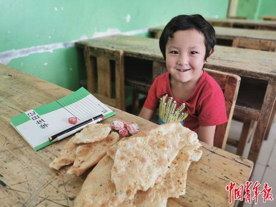 2020年9月10日,开学第一天,一年级新生伊曼努尔的书包里装着两颗花生奶糖、六块馕和作业本,这是哥哥姐姐为她准备的。中青报·中青网记者 王雪迎/摄