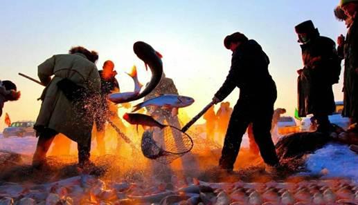 一到冬天,湖面会完全冰冻,居住在湖畔的人们在这最冷的季节,展开查干湖冬捕。渔民们坐着马车上冰湖,一是为了减少污染,二是尽量少惊动湖里的鱼群。马拉绞盘拖网的原始捕捞方式,单网捕捞量不断刷新着吉尼斯世界纪录。对湖泊生态的影响小,保证了鱼群的生生不息。