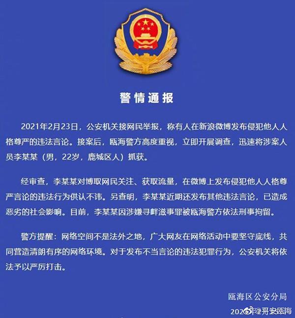前述警情通报称,2021年2月23日,公安机关接网民举报,称有人在新浪微博发布侵犯他人人格尊严的违法言论。接案后,属地瓯海警方高度重视,立即开展调查,迅速将涉案人员李某某(男,22岁,鹿城区人)抓获。