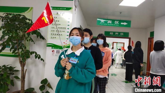 应征女青年编号列队进行体检。 杨宗盛 摄