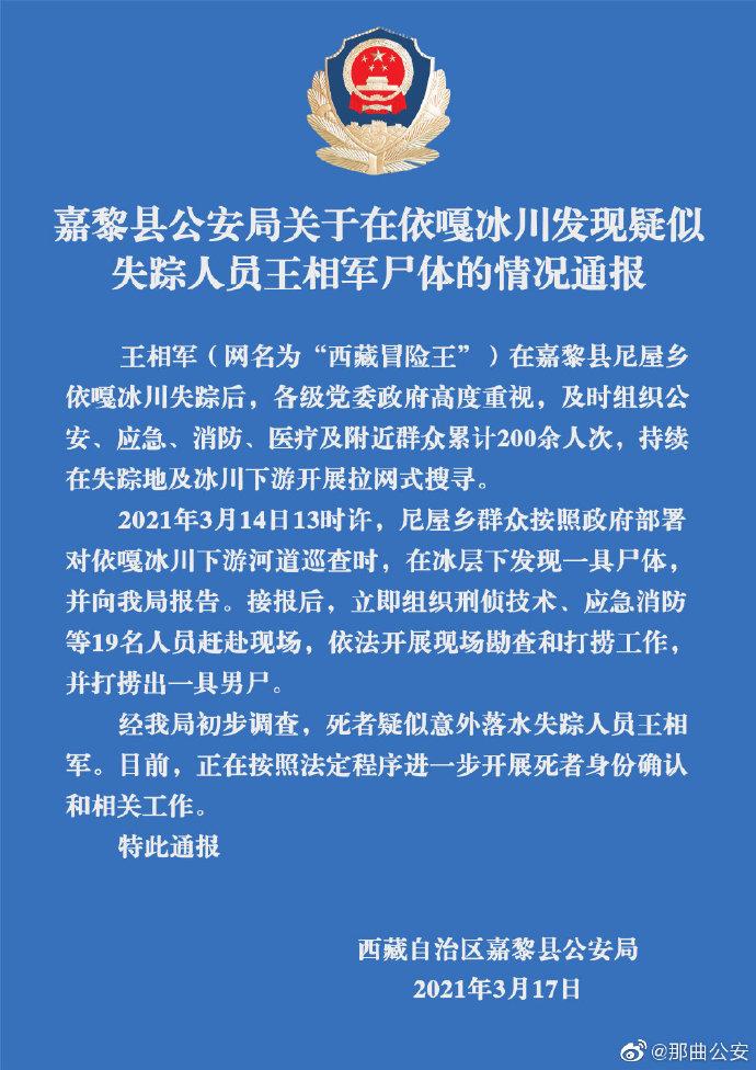 中国网3月18日讯 西藏自治区嘉黎县公安局18日发布关于在依嘎冰川发现疑似失踪人员王相军尸体的情况通报。