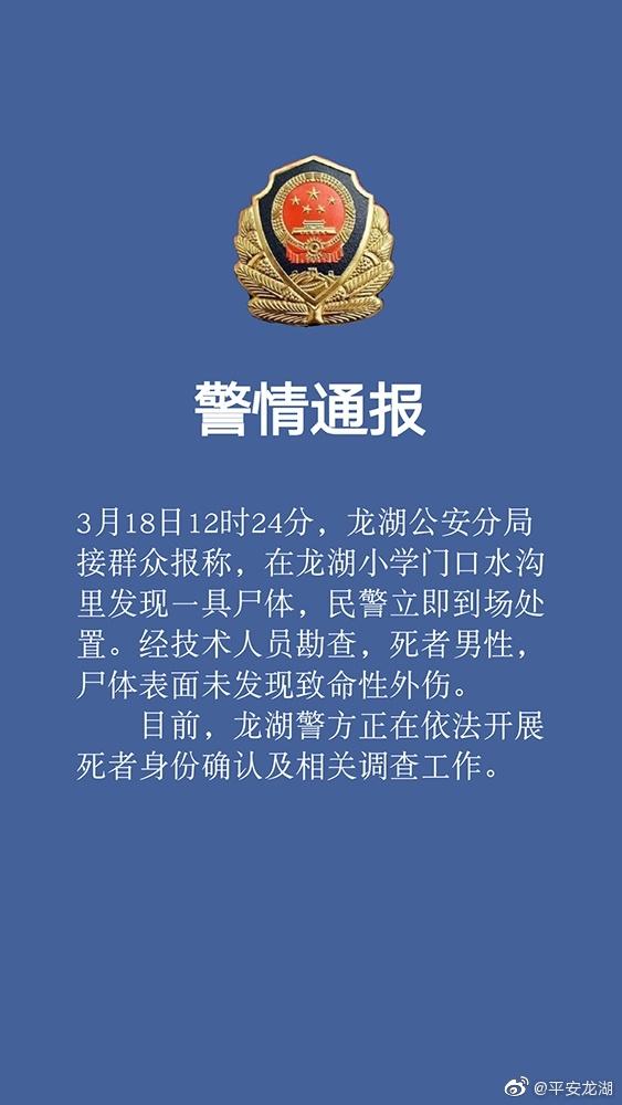 @平安龙湖 消息:3月18日12时24分,汕头市公安局龙湖分局接群众报称,在龙湖小学门口水沟里发现一具尸体,民警立即到场处置。经技术人员勘查,死者男性,尸体表面未发现致命性外伤。目前,龙湖警方正在依法开展死者身份确认及相关调查工作。