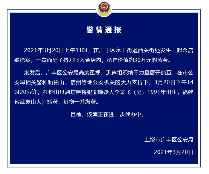 江西上饶市广丰区公安局微信公众号“广丰公安”消息:3月20日上午11时,在广丰区永丰街道西关街处发生一起金店被抢案,一蒙面男子持刀闯入金店内,抢走价值约30万元的黄金。