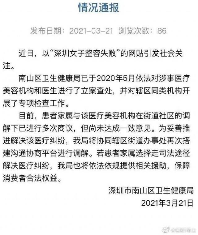 3月21日,深圳市南山区委(区政府)官方微博@创新南山 发布通报称,涉事医疗美容机构和医生已被立案查处。