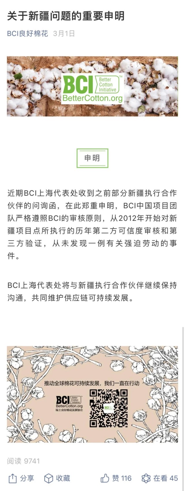 声明称:近期BCI上海代表处收到之前部分新疆执行合作伙伴的问询函,在此郑重申明,BCI中国项目团队严格遵照BCI的审核原则,从2012年开始对新疆项目点所执行的历年第二方可信度审核和第三方验证,从未发现一例有关强迫劳动的事件。