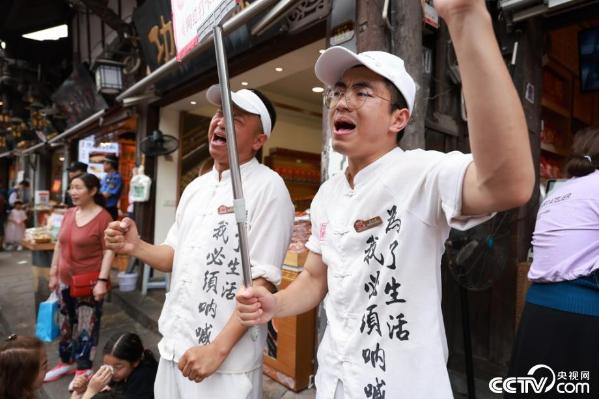 2021年5月4日,重庆磁器口,纷繁的商业,接踵而至的游客,催生了一种新的职业——吆喝师。站在店铺门口,扯着嗓子吆喝,是他们每天的工作。他们的吆喝声,回荡在石板路和青瓦之上,成为古镇一道风景。 视觉中国
