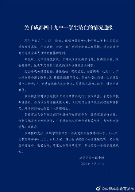 成都市成华区教育局官方微博5月11日凌晨通报,经联合调查组全面调查认定,成都49中高二学生林某某在学校发生高空坠亡属个人行为,排除刑案;未发现存在体罚、辱骂等师德失范问题,未发现该生受到校园欺凌情况。调查组指出,该事件表明,学校在学生心理关爱方面存在薄弱环节。