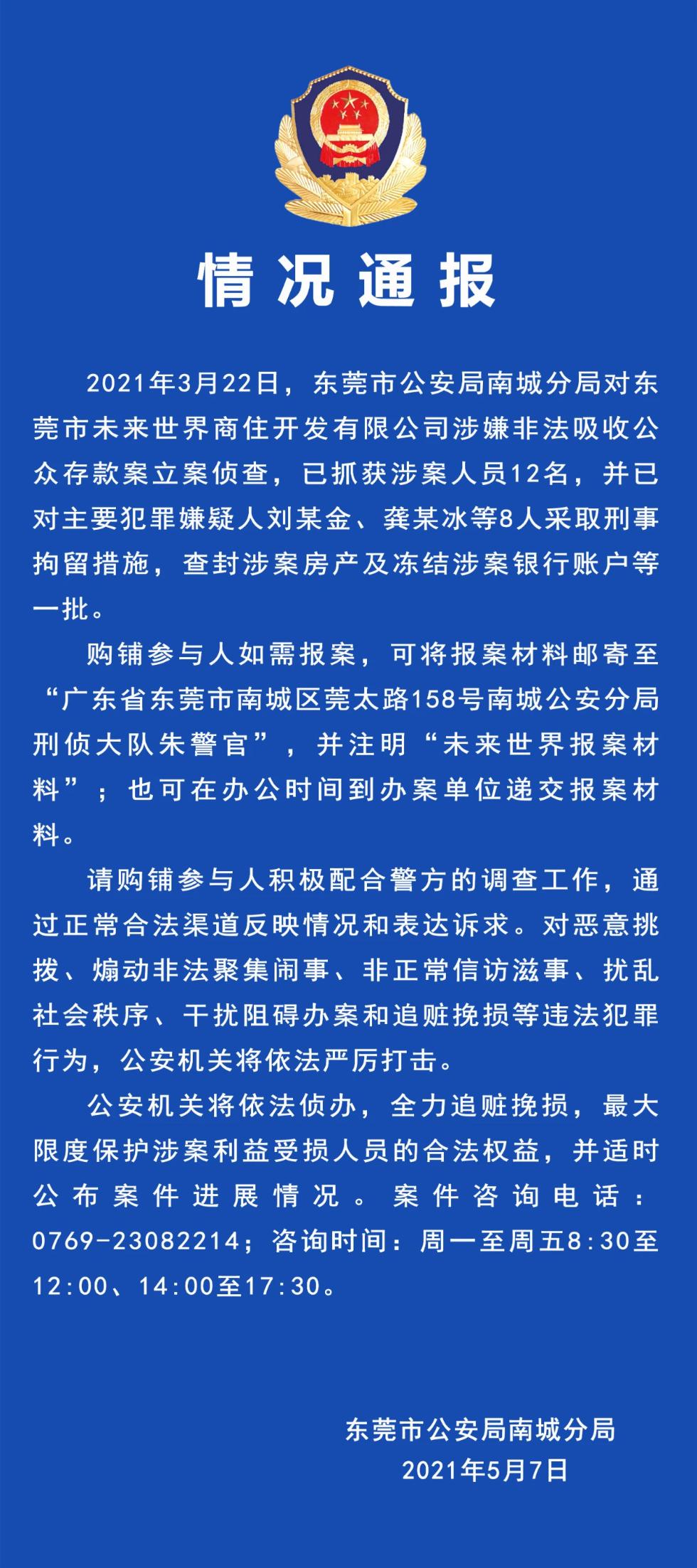 据广东东莞市公安局南城分局官方微信公众号“平安南城”近日通报,今年3月22日,该公安分局对东莞市未来世界商住开发有限公司涉嫌非法吸收公众存款案立案侦查,已抓获涉案人员12名,并已对主要犯罪嫌疑人刘某金、龚某冰等8人采取刑事拘留措施,查封涉案房产及冻结涉案银行账户等一批。