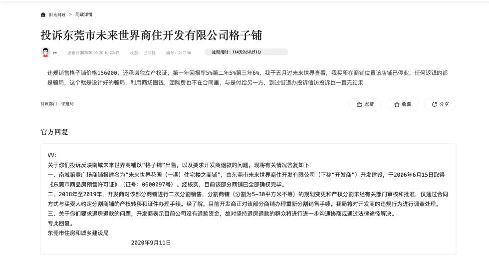 澎湃新闻注意到,2020年5月,有网友在东莞阳光热线问政平台投诉称,未来世界公司违规销售格子铺,并承诺独立产权证,“第一年回报率5%,第二年5%,第三年6%”。然而,2020年5月,其实地查看发现,所买的店铺已停业,“任何返钱的都是骗局,这个就是设计好的骗局”。