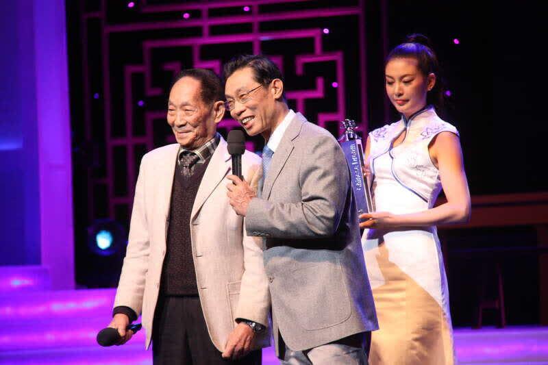 2011年12月10日,广东广州,由《南方周末》主办的“2011中国梦践行者致敬盛典”上,袁隆平(左一)与中国工程院院士、著名呼吸病学家钟南山合影。视觉中国供图