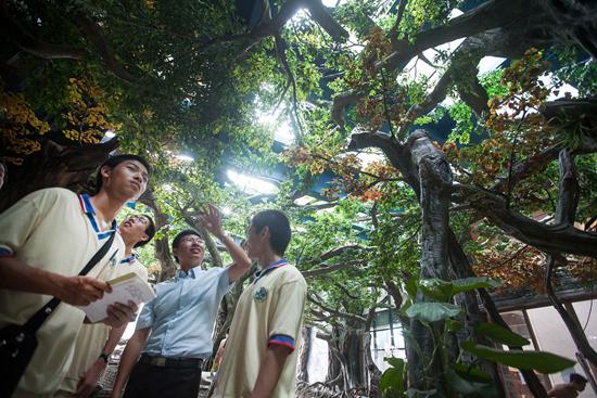 2014年6月19日,广东顺德,毕业生曹愉超(右一)向所在实习公司的经理提出”增加落叶“的布置。