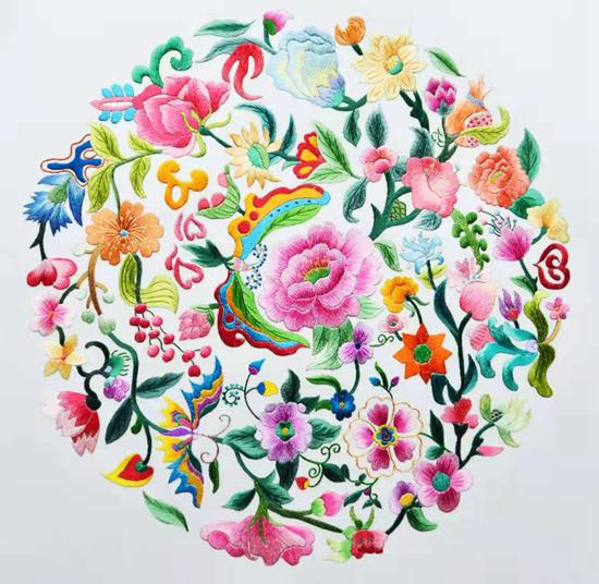 各种色彩的线在指尖跳跃,杨华珍的眼前渐渐浮现出故乡的大山,漫山遍野颜色各异的花开得正好。红的、紫的、黄的……数不清的颜色就这样欢快地撞在一起,那是生命的色彩,也是杨华珍创作灵感的源泉。