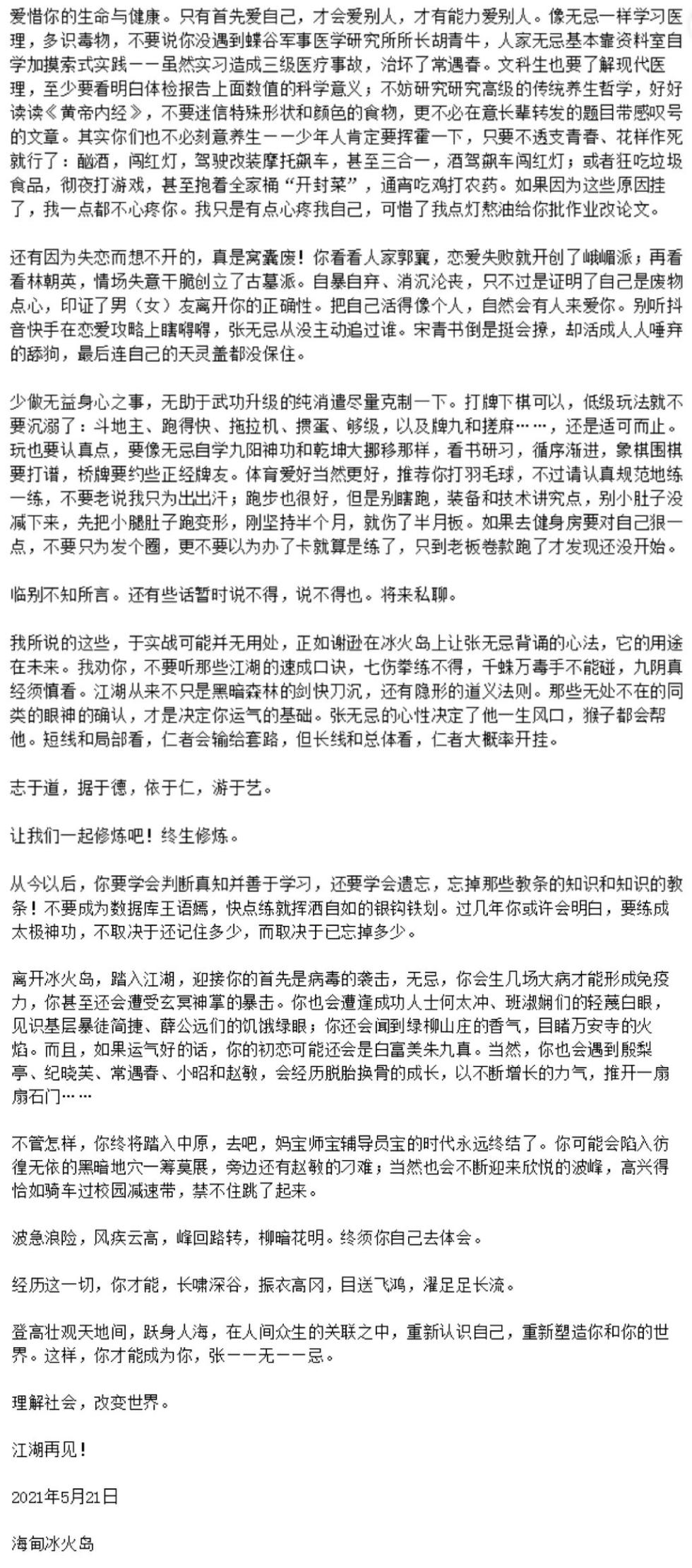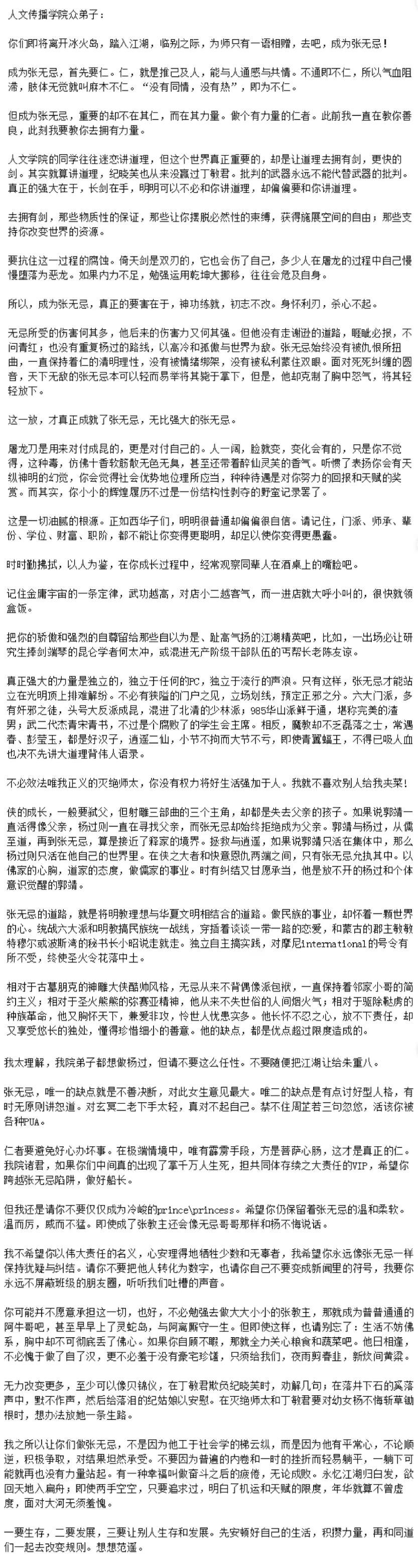 “我之所以让你们做张无忌,不是因为他工于社会学的梯云纵,而是因为他有平常心。”刘复生在致辞中这样写道。他告诉记者,“成为张无忌”其实是自己希望同学们都能成为正直的人,心怀改变社会的理想主义。