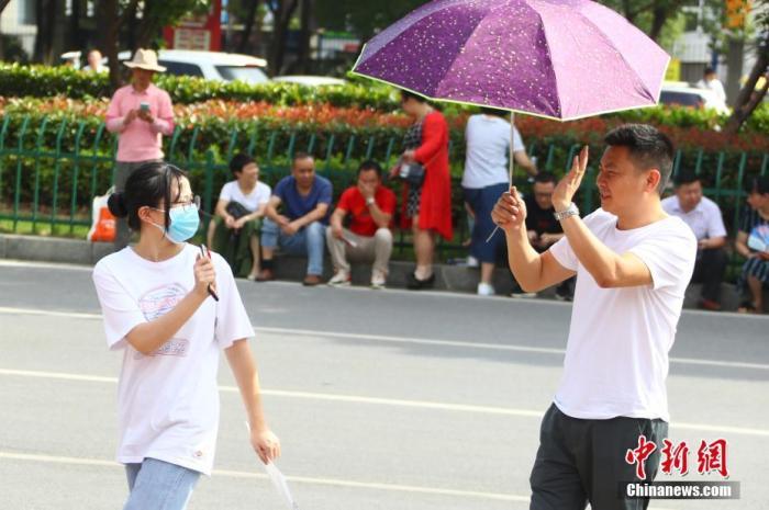 6月8日上午,家长将考生送抵江西省南昌市第十九中学考点后挥手暂别。中新社记者 刘占昆 摄