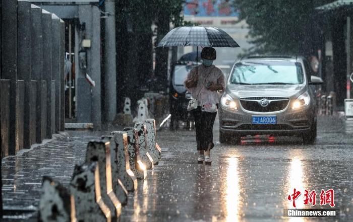 7月12日,北京朝阳区团结湖附近,市民冒雨出行。中新社记者 贾天勇 摄