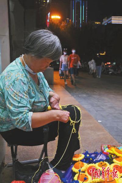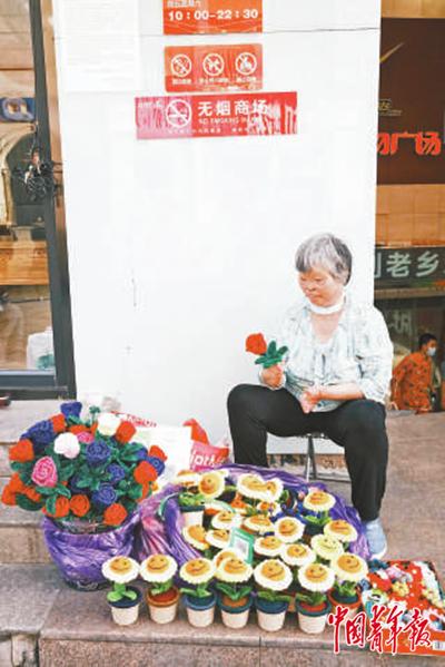 江汉路是武汉最繁华的商业街之一,芦桂芝一坐就是八九个小时。她不吆喝,花上摆了一张写着“因火致残、收养弃婴”的纸板,编织花价格从5元到65元不等,最受欢迎的是40元的太阳花。