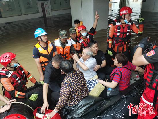 7月22日,阜外华中心血管病医院,一位老人被送上救生艇后,向救援人员抱拳致谢。 中青报·中青网记者 耿学清/摄