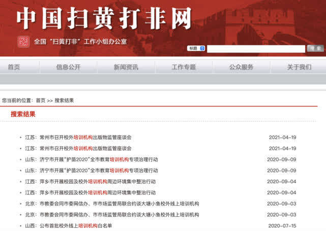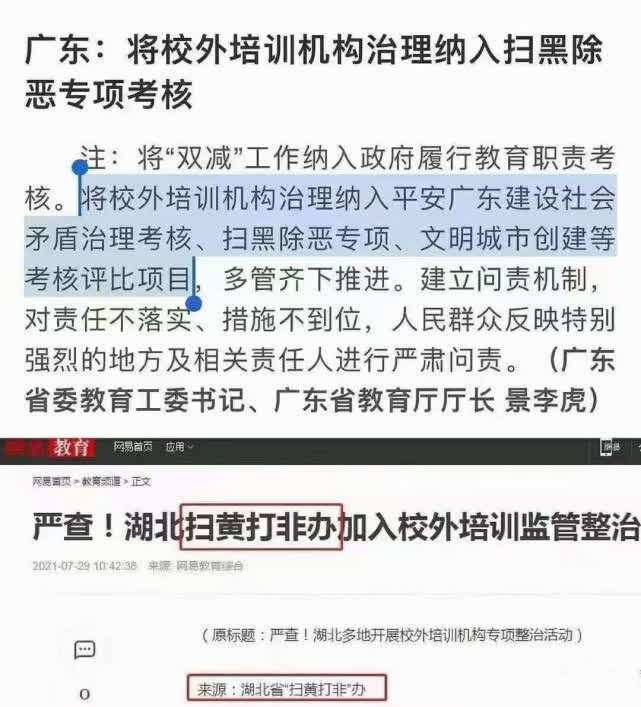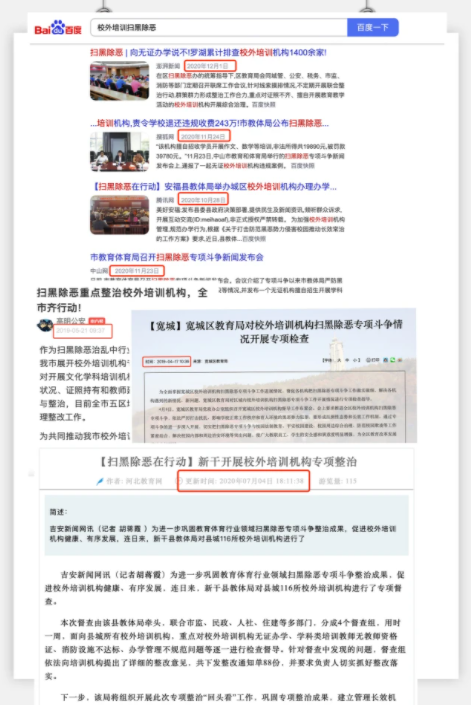7月30日,一个截图开始在微博、微信朋友圈等网络平台流传,内容包括题为《广东:将校外培训机构治理纳入扫黑除恶专项考核》和《严查!湖北扫黄打非办加入校外培训监督整治》的两则自媒体消息。
