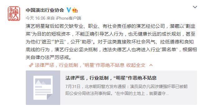 中国演出行业协会称,吴亦凡案暴露出的诸多问题,不仅对全社会有教育和警示意义,更给整个演艺行业敲响警钟。