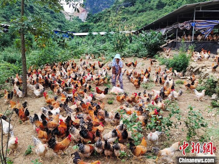 资料图:养殖员在给鸡喂食。 黄艳梅 摄