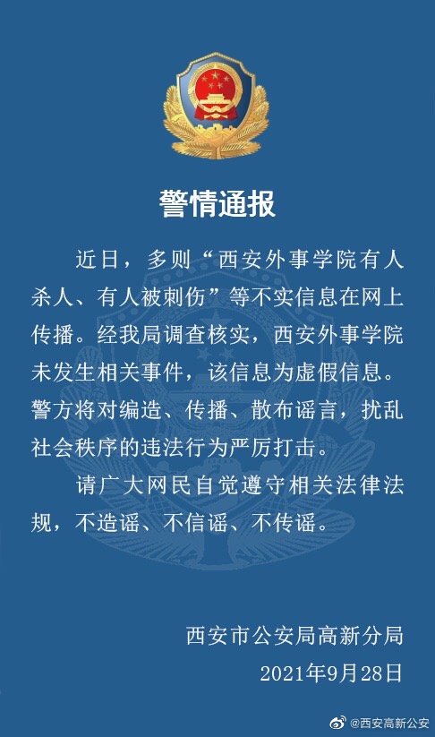 西安市公安局高新分局9月28日在其官方微博上通报,近日,多则“西安外事学院有人杀人、有人被刺伤”等不实信息在网上传播。经该局调查核实,西安外事学院未发生相关事件,该信息为虚假信息。