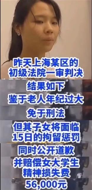 此外,视频内还提到上海某区的初级(人民)法院一审判决结果:“鉴于老人年纪过大,免于刑法(罚),但其子女将面临15日的拘留惩罚。同时公开道歉,并赔偿女大学生精神损失费56000元。”