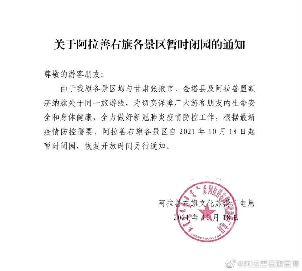 10月19日午间,据阿拉善右旗官博,阿拉善右旗文化旅游广东局发文称,由于阿拉善右旗各景区均与甘肃张掖市、金塔县及阿拉善盟额济纳旗处于同一旅游线 ,根据最新疫情防控需要,阿拉善右旗各景区暂时闭园,恢复开放时间另行通知。