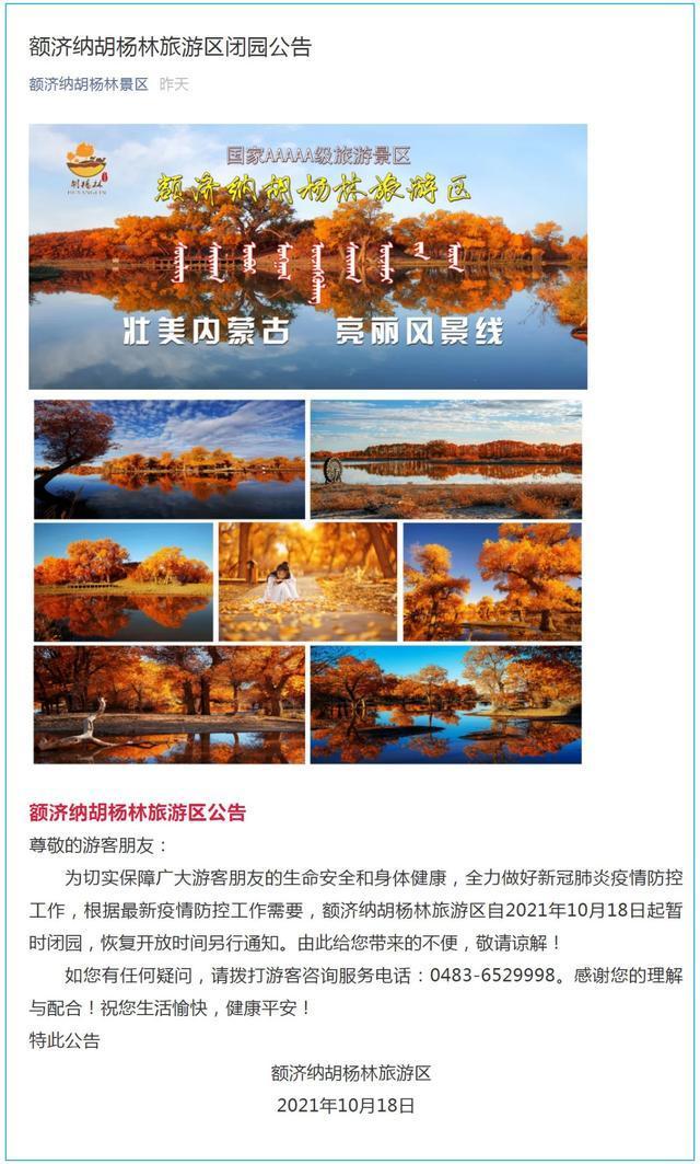 公告称,为切实保障广大游客朋友的生命安全和身体健康,全力做好新冠肺炎疫情防控工作,根据最新疫情防控工作需要,额济纳胡杨林旅游区自2021年10月18日起暂时闭园,恢复开放时间另行通知。