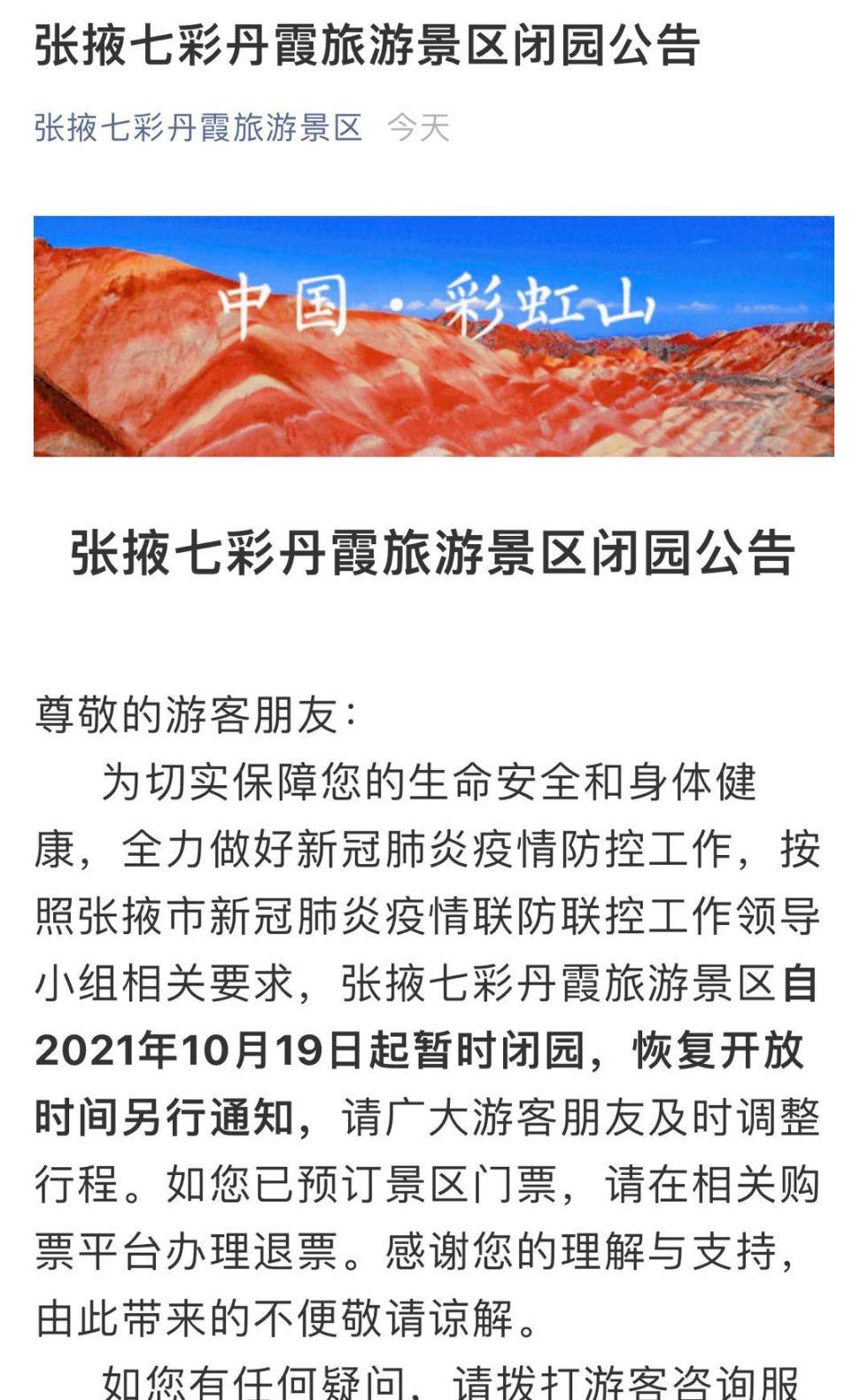 10月19日,“张掖七彩丹霞旅游景区”微信公众号发布闭园公告称,为切实保障您的生命安全和身体健康,全力做好新冠肺炎疫情防控工作,按照张掖市新冠肺炎疫情联防联控工作领导小组相关要求,张掖七彩丹霞旅游景区自2021年10月19日起暂时闭园,恢复开放时间另行通知。