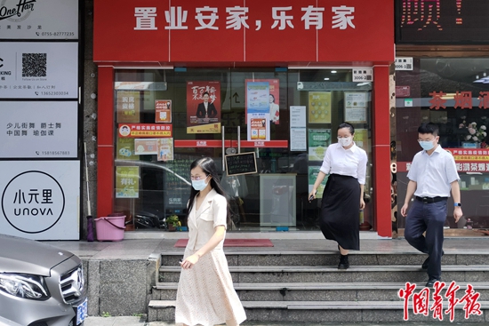 10月14日,几名年轻人路过位于深圳市福田区彩田路一家房产中介门店。中青报·中青网记者 刘芳/摄