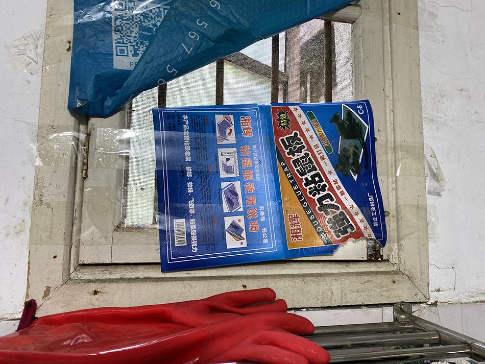 卫生间的纱窗破了洞,贴着纸板。