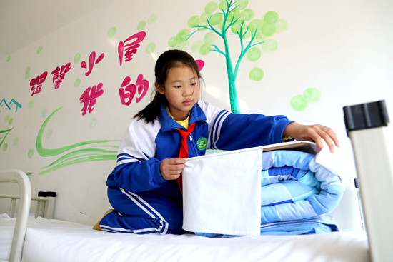 10月20日,兴安盟科尔沁右翼前旗俄体小学学生在整理宿舍。韩双龙/摄