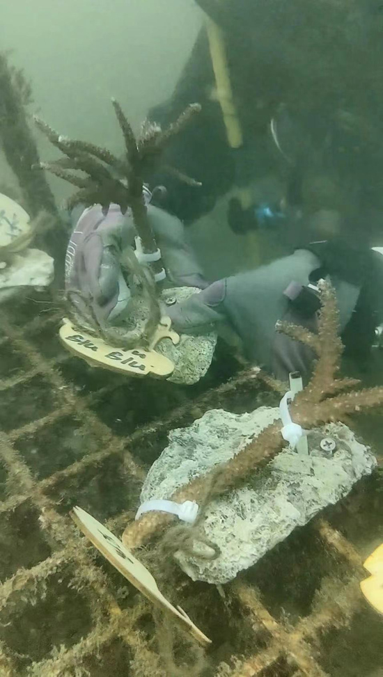 “无境深蓝”的潜水队员在种珊瑚。 受访者供图