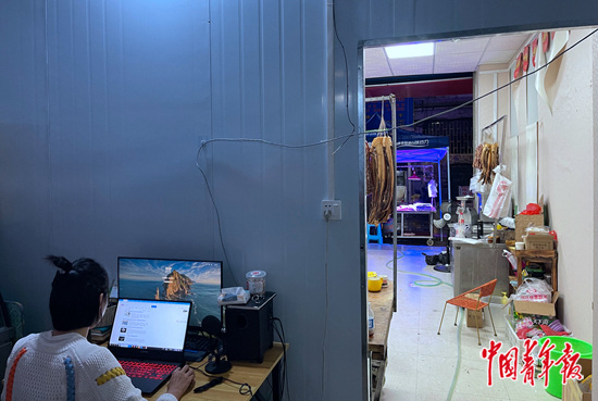 罗静在猪肉铺里间写作。