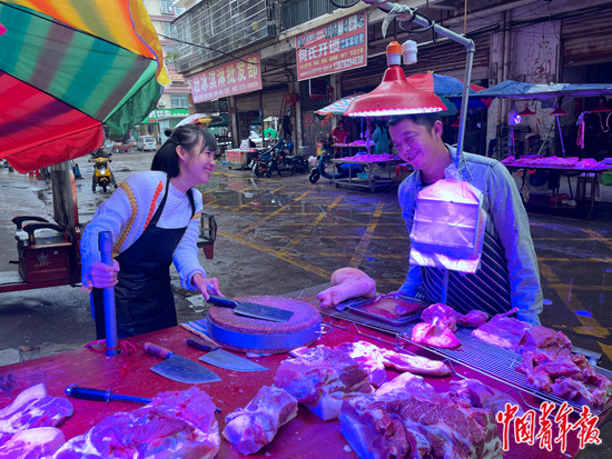 三个年轻人经营着猪肉铺。左起依次为罗有威、罗静、廖立峰。