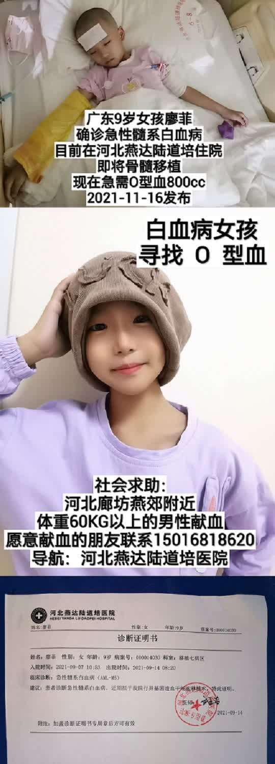 11月16日下午,廊坊三河燕郊消防救援站接到来自广东省廖艺女士的求助电话,她9岁的外甥女廖菲身患急性髓系白血病,目前正在燕郊陆道培医院住院接受治疗。11月23日,廖菲小朋友要进行骨髓移植手术,但医院血库告急,需O型血储备至少800毫升,才能确保手术的顺利进行。万般无奈,她尝试着拨打“119”电话,向当地消防救援人员寻求帮助。