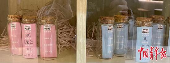 北京一家售卖脱单盲盒的咖啡店,摆出的脱单盲盒上写着个人昵称、星座和要求。 中青报·中青网记者 孟佩佩/摄