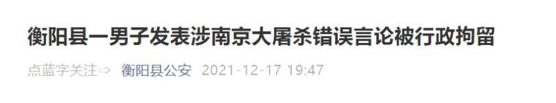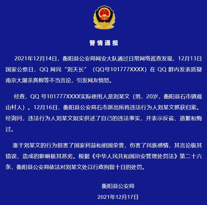 2021年12月14日,衡阳县公安局网安大队通过日常网络巡查发现,12月13日国家公祭日,QQ网民“刘天长”(QQ号101777XXXX)在QQ群内发表质疑南京大屠杀真假等不当言论,引发网友愤怒。
