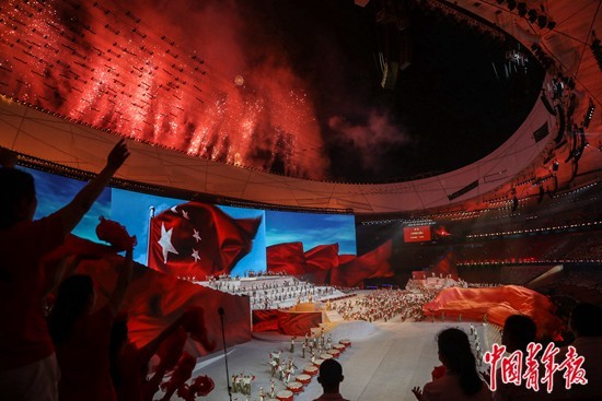 2021年6月28日,北京国家体育场,庆祝中国共产党成立100周年大型文艺演出《伟大征程》第二篇章“风雨无阻”以舞蹈《开国大典》开篇,体育场外点燃璀璨的烟花。中青报·中青网记者 赵迪/摄