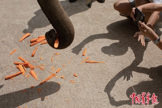 2021年6月17日,云南省西双版纳傣族自治州野象谷景区内的亚洲象种源繁育及救助中心,媒体记者拍摄进食中的大象。6月中下旬,15头从西双版纳出走后一路北移的亚洲象在云南省玉溪市易门县、峨山县来回移动。它们的一举一动都备受瞩目,也使当地人象共栖的现状走进公众视野。中青报·中青网记者 李隽辉/摄