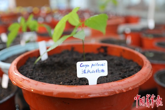 章为平种下的波氏山核桃长出了叶片。中青报·中青网记者 左橙/摄