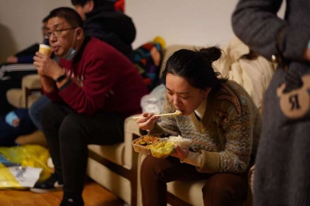 休息室内的医护人员正在补充体力,迎接这场贯穿长夜的战疫