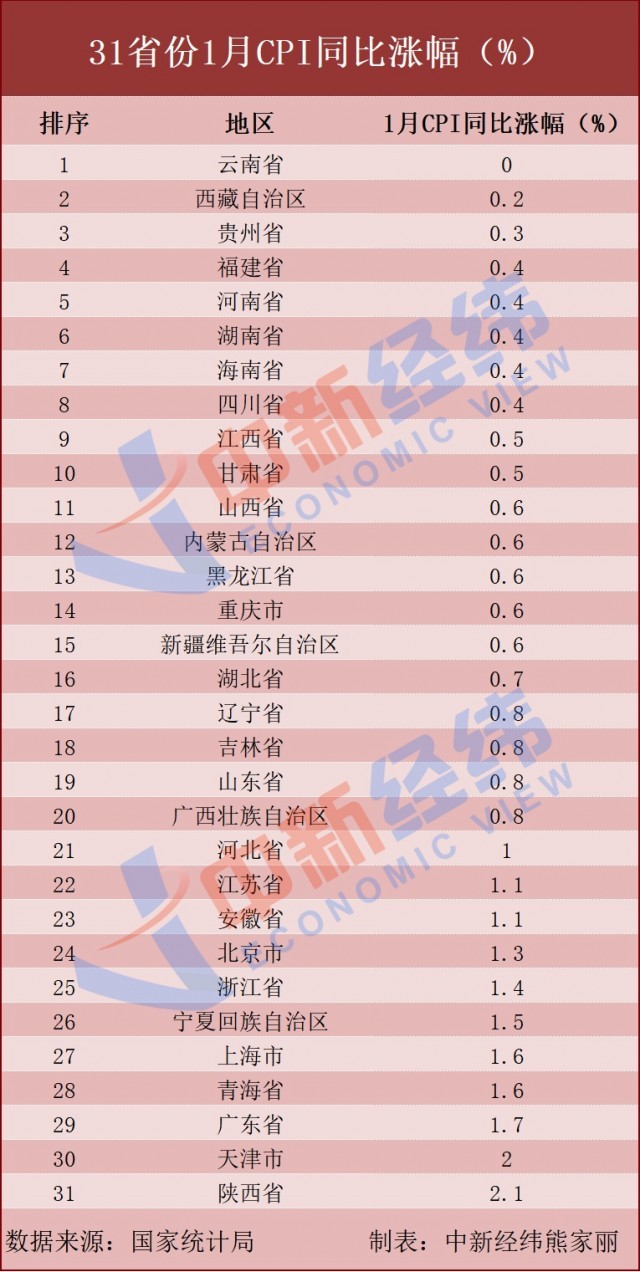 1月份全国各地物价涨势如何?近日,国家统计局公布了31省份2022年1月份居民消费价格指数(CPI)。中新经纬梳理发现,1月20省份CPI同比涨幅低于全国,云南物价则与上月(2021年12月)持平。