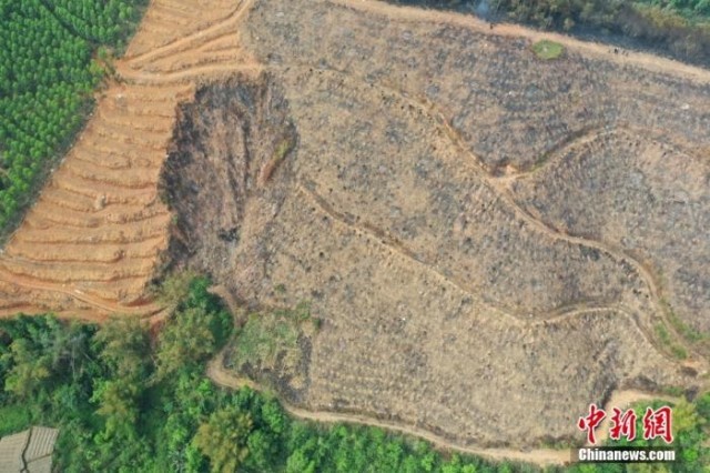 图为3月22日,航拍的东航客机坠毁现场画面。中新社记者 陈冠言 摄
