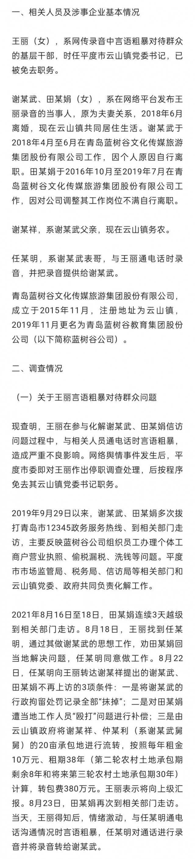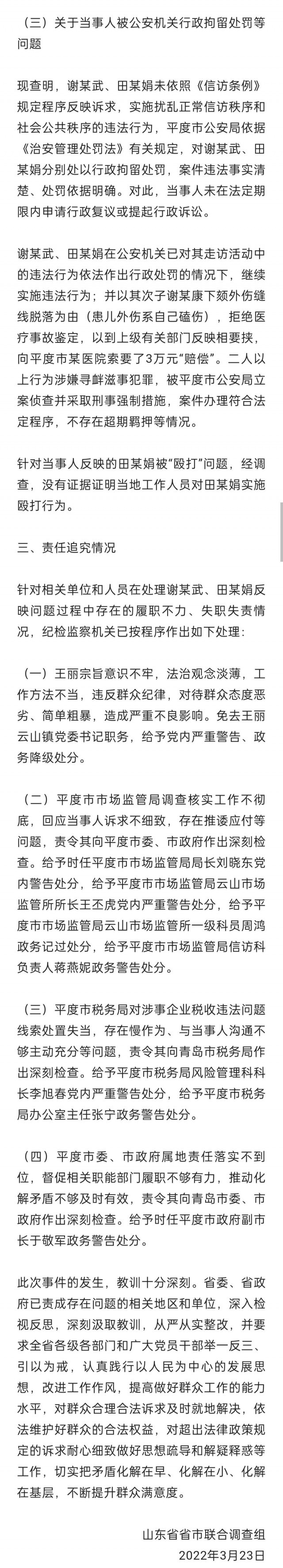 3月23日,山东省省市联合调查组发布《关于平度市云山镇一基层干部言语粗暴对待群众问题调查处理情况的通报》。针对平度市云山镇一基层干部言语粗暴对待群众问题,山东省委高度重视,派出省市联合调查组深入开展调查工作。省市联合调查组约见了当事人,对其反映的问题全面调查核实。现将有关情况通报如下。