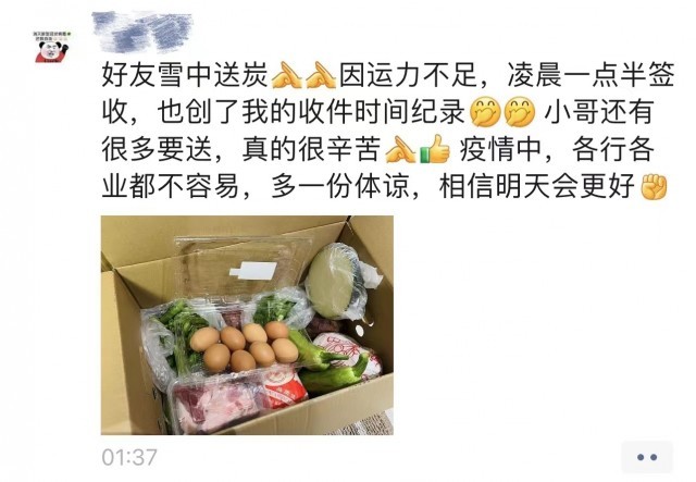 中新经纬记者了解到,3月30日凌晨1点,家住上海浦西区的汤先生收到了好友寄来的一箱蔬菜,他在朋友圈感慨道:“因运力不足,凌晨一点半签收,也创了我的收件时间纪录。小哥还有很多要送,真的很辛苦。”