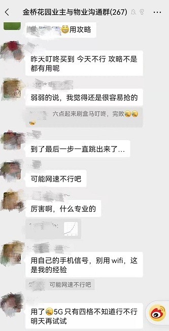 由于封闭措施和线下商超抢购难,很多上海市民选择在社区微信群里团购买菜。汤先生的业主群里每天都在分享“抢菜攻略”,比如一位业主说:“盒马是前一天把想买的东西都放入购物车,多选些品类,到营业时间的时候就去点击结算,我用的是一秒3次的频率。”
