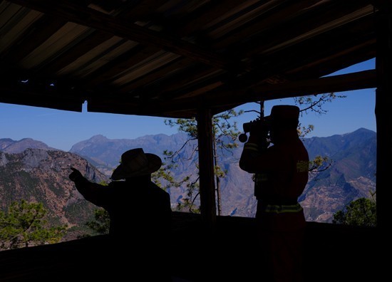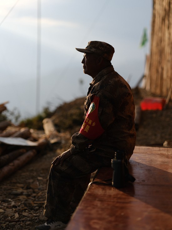 3月15日,木里县项脚蒙古族乡林区,60岁的瞭望员胡长保在山顶的瞭望塔前观察火情。他所值守的瞭望塔海拔3200米,他常常一待就是半个多月,吃住都在山上。