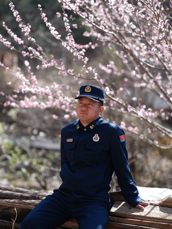 3月15日,木里县项脚蒙古族乡项脚村,消防员伍正忠坐在一棵桃树旁。